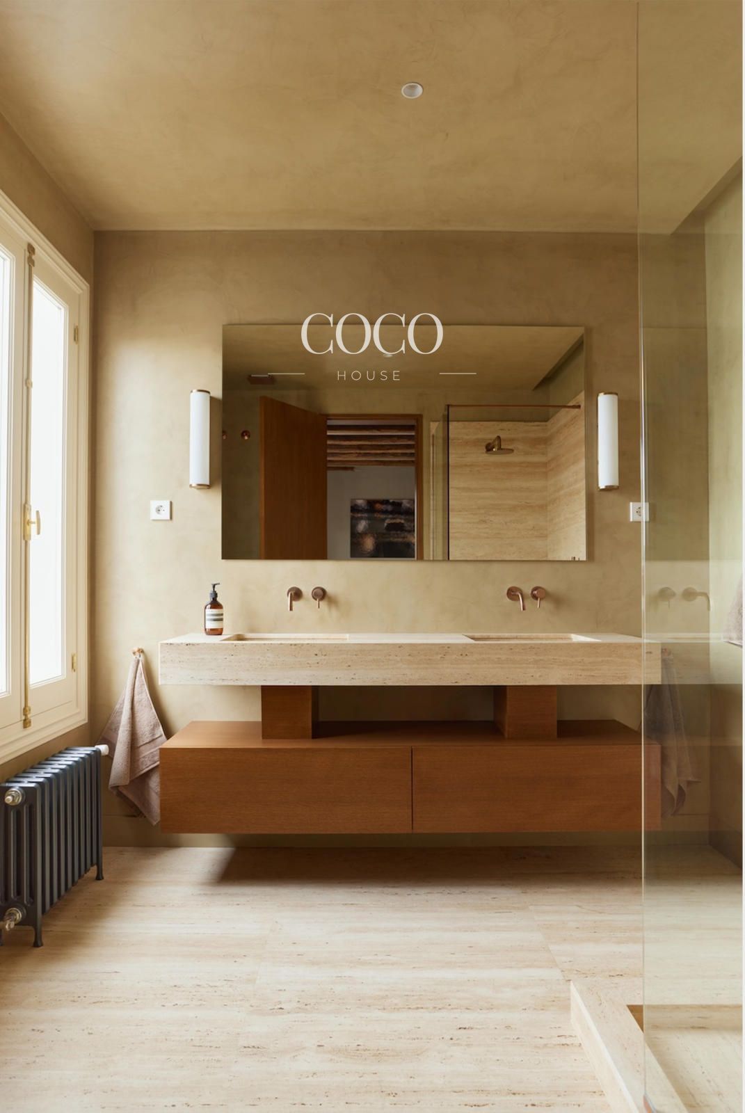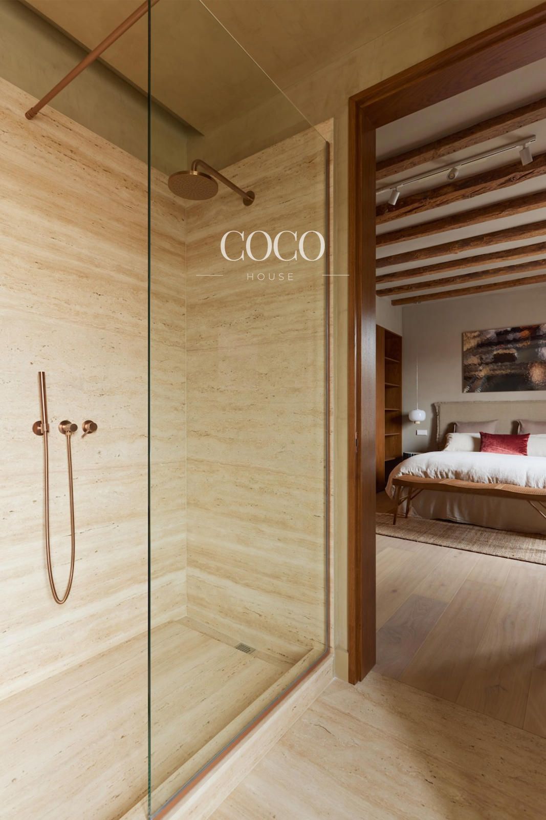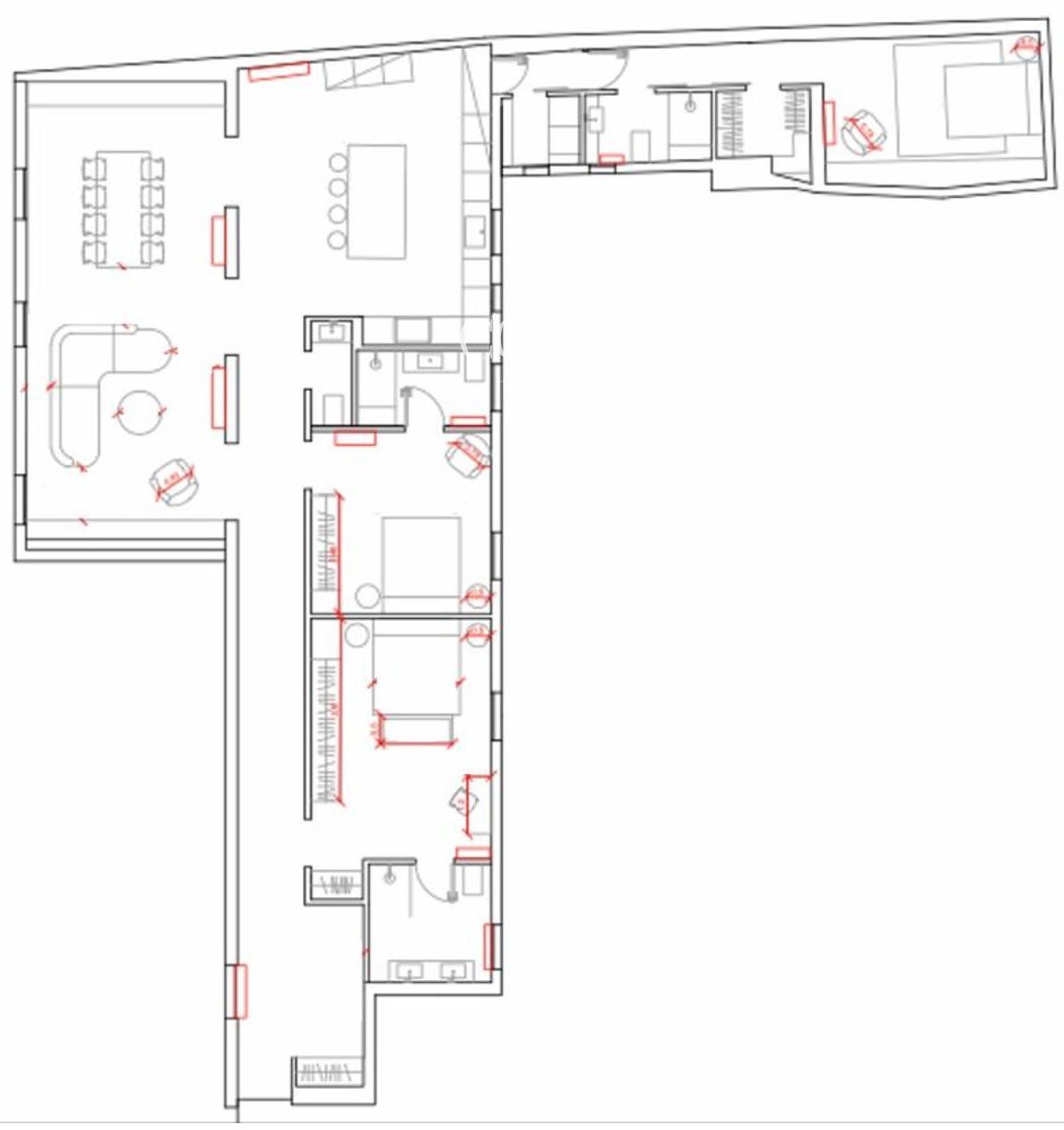 Se trata de un piso exterior con techos de aproximadamente cinco metros de altura, lo que aporta una sensación de amplitud y luminosidad extraordinarias. La vivienda cuenta con tres amplios dormitorios en suite, tres baños completos y un aseo de cortesía. La cocina, de diseño abierto e integrada en el salón, está equipada con electrodomésticos Gaggenau de última generación y acabada en mármol travertino, presente también en los baños.