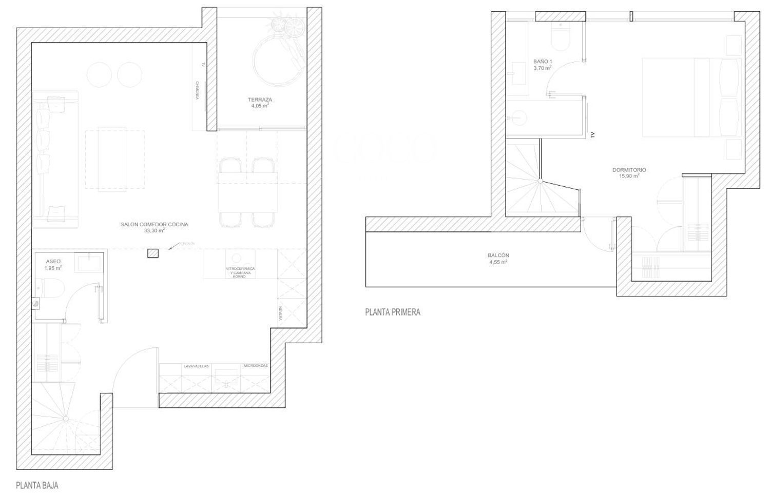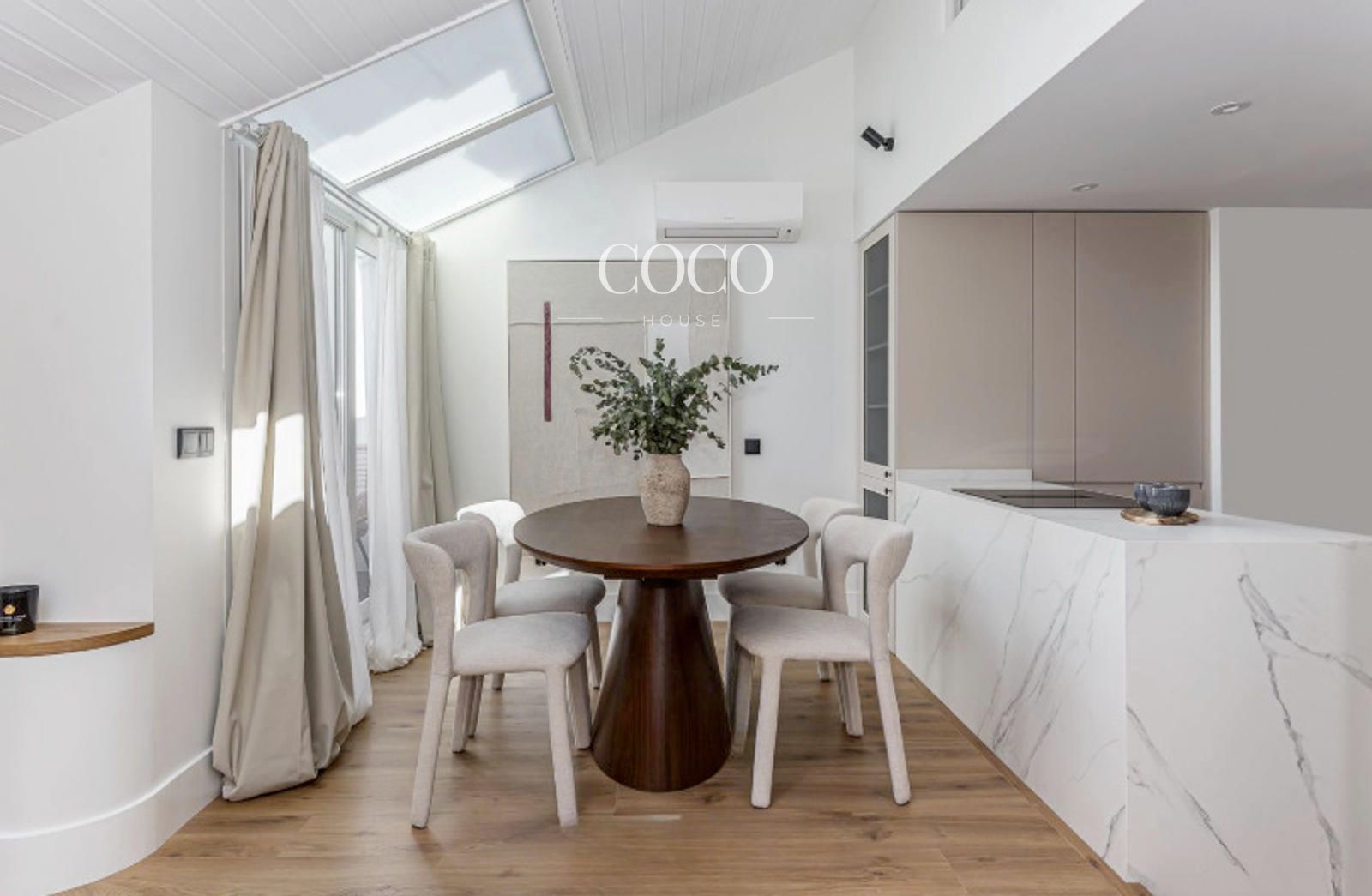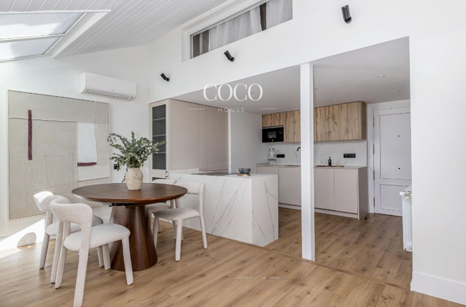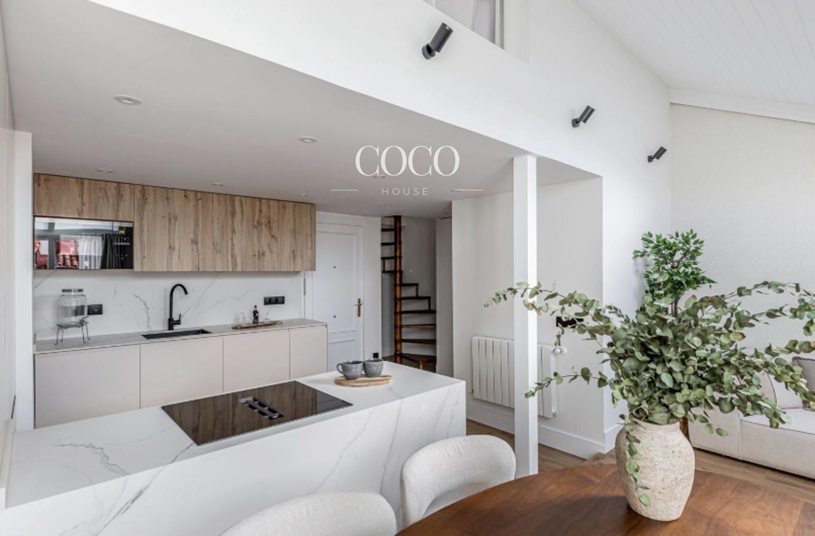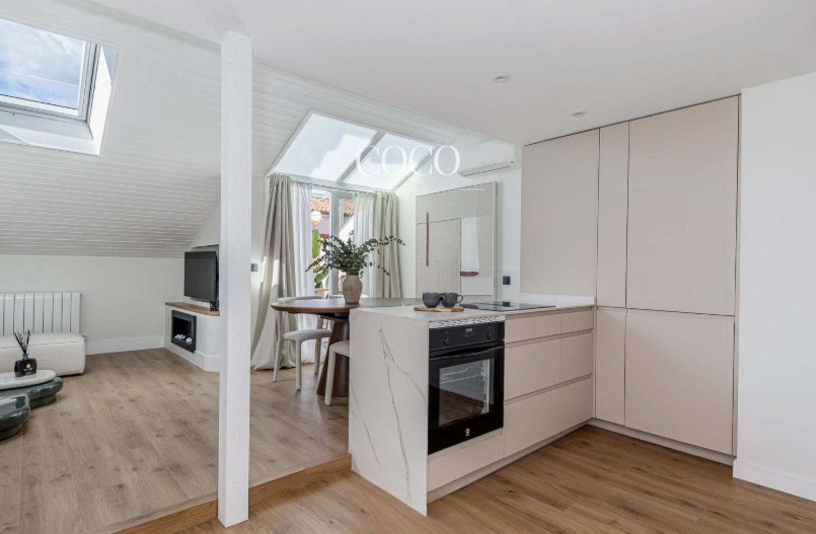 Situado en una cuarta planta, el dúplex se distribuye en dos niveles. En la primera planta se encuentra un amplio salón-comedor con cocina integrada, un espacio abierto y funcional ideal tanto para el día a día como para recibir invitados. Grandes ventanales aportan abundante luz natural y dan acceso a una terraza privada, perfecta para desayunar al aire libre o relajarse al final del día. En esta planta también hay un aseo de cortesía.
