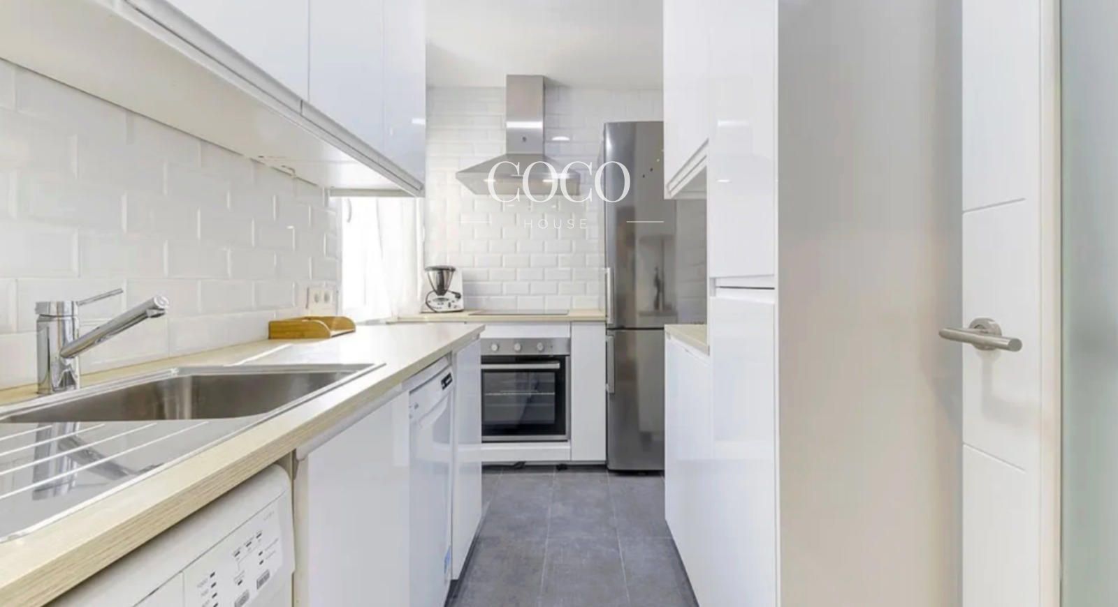 La cocina está totalmente equipada con nevera, microondas, lavasecadora y menaje completo, ofreciendo practicidad y un estilo contemporáneo. Su distribución facilita el día a día sin renunciar a una estética moderna y limpia.