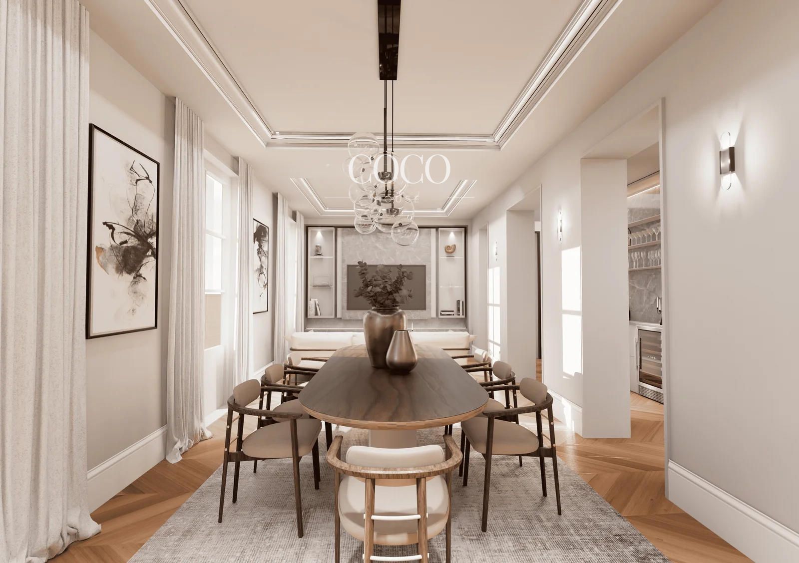 Destacan los suelos de madera de roble, que aportan calidez y elegancia a toda la vivienda, así como la carpintería de excelente calidad, tanto interior como exterior, reflejo del alto nivel de la reforma y del cuidado por el detalle.