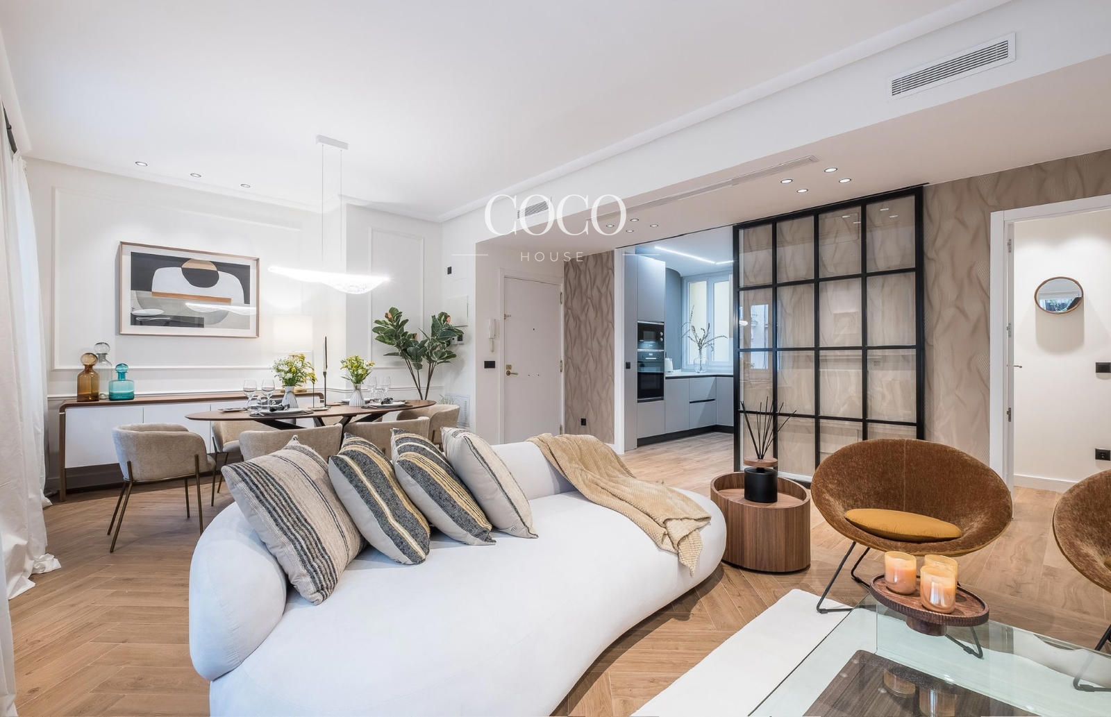 Ubicada en una quinta planta de un edificio de fachada emblemática con ascensor y portero físico, esta propiedad de 152 m² combina el encanto de la arquitectura clásica con una reforma integral de diseño contemporáneo y calidades de primera. El proyecto ha respetado la esencia original del inmueble, incorporando elementos como techos altos con molduras y vidrieras originales, que aportan carácter y sofisticación, al tiempo que introduce una distribución funcional y elegante.