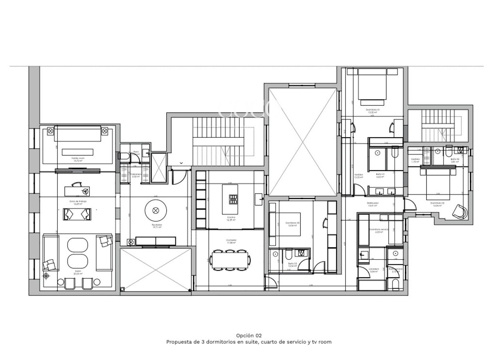 3 dormitorios en suite + dormitorio de servicio + lavandería