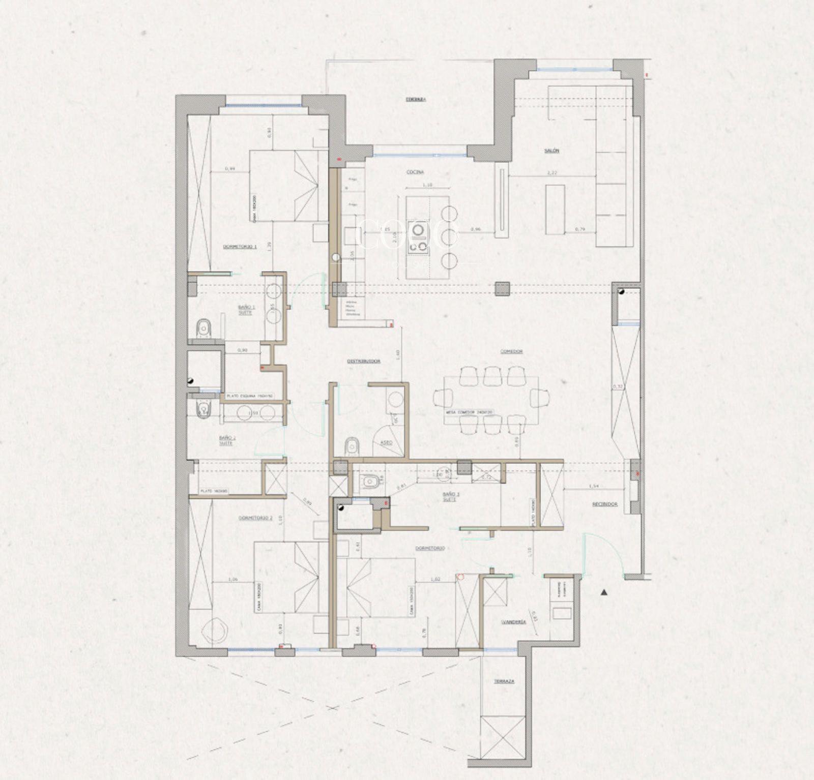 La distribución se organiza en un amplio salón-comedor con acceso a una terraza de 10 m², perfecta para disfrutar del aire libre en pleno centro de la ciudad. La cocina, equipada y con zona de lavandería independiente, se integra de manera práctica y sofisticada en el conjunto. La zona de descanso cuenta con tres dormitorios en suite, todos con baño privado y armarios empotrados, además de un aseo de invitados que complementa la vivienda.