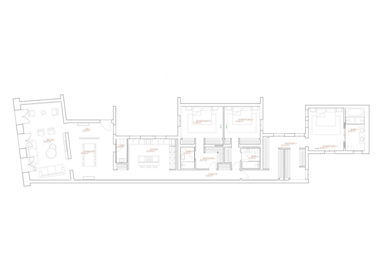La propiedad cuenta con un amplio y luminoso salón exterior con tres balcones a la calle, un comedor independiente y aseo de invitados. La cocina, espaciosa e independiente, está totalmente equipada. La zona de descanso se distribuye en tres dormitorios: dos dobles con baño en suite y el principal con dos vestidores y baño en suite con bañera y doble lavabo. Además, dispone de una práctica zona de lavandería independiente.