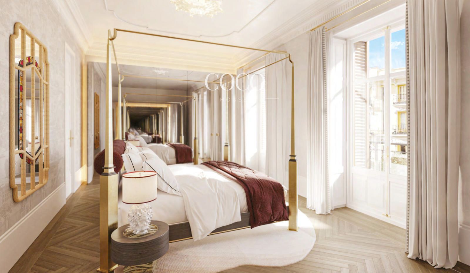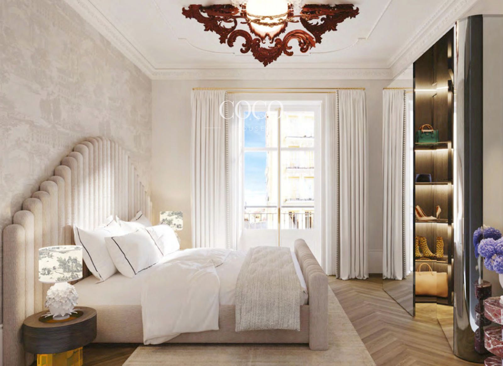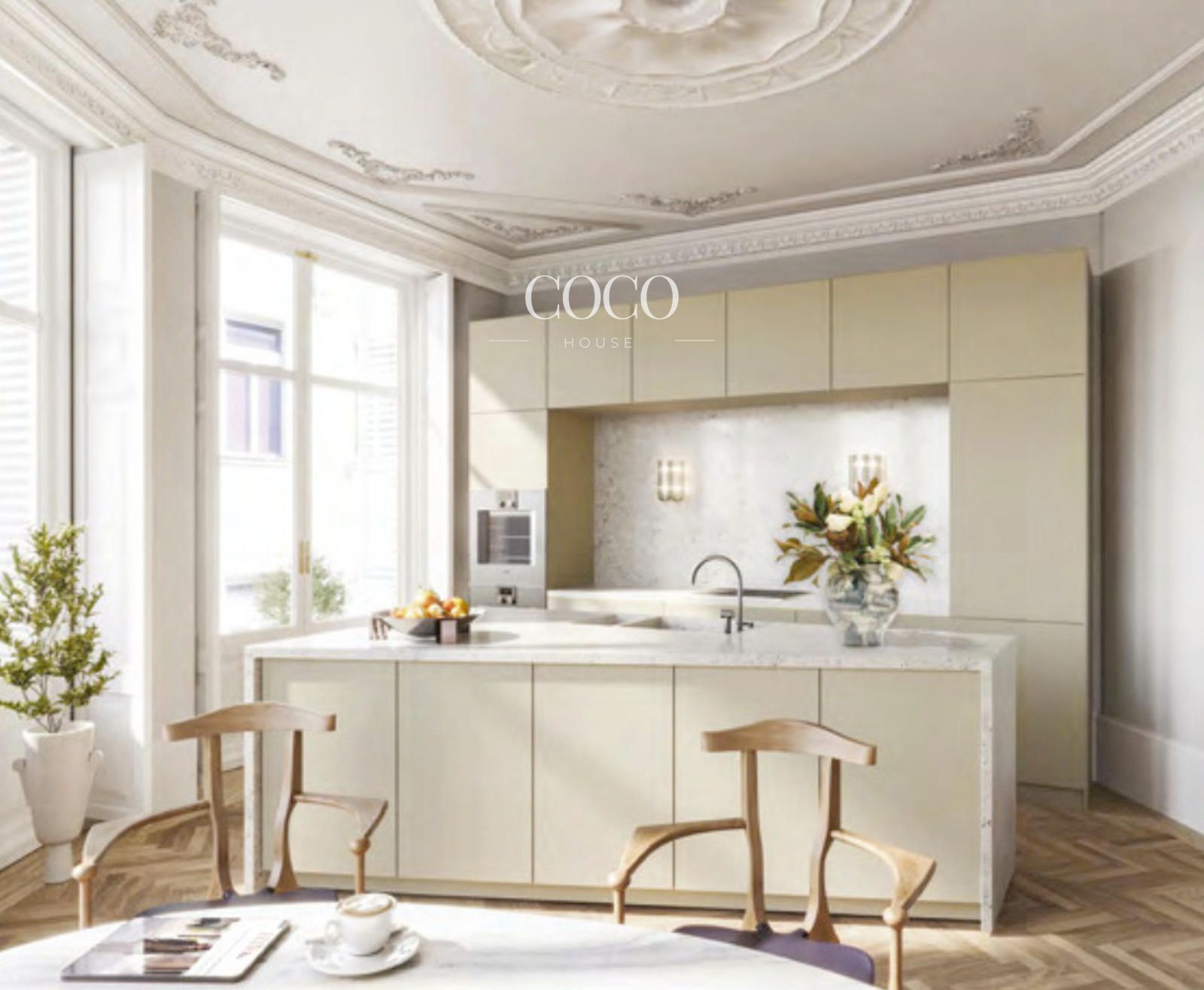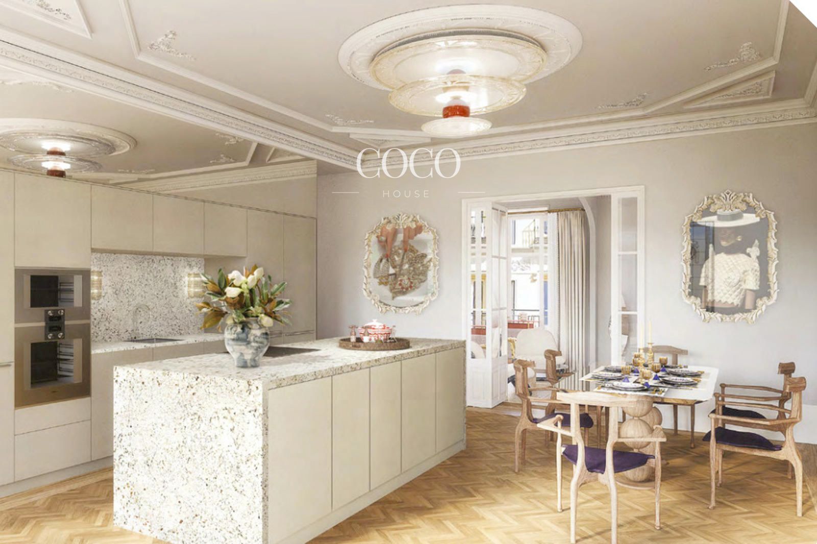 Elegantes viviendas de tres dormitorios que destacan por su amplitud, luminosidad y acabados de excelencia: suelos de madera chevron, molduras clásicas, cocinas Bulthaup, electrodomésticos Gaggenau y baños de mármol Ocean y travertino gris.