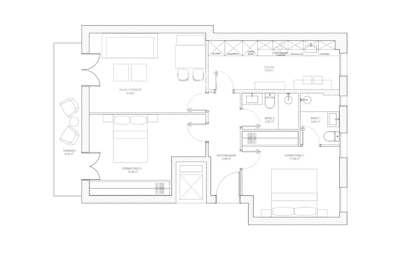 Dispone de 2 dormitorios y 2 baños, además de un salón-comedor luminoso con acceso a una acogedora terraza interior orientada al patio de manzana, lo que garantiza tranquilidad y silencio.