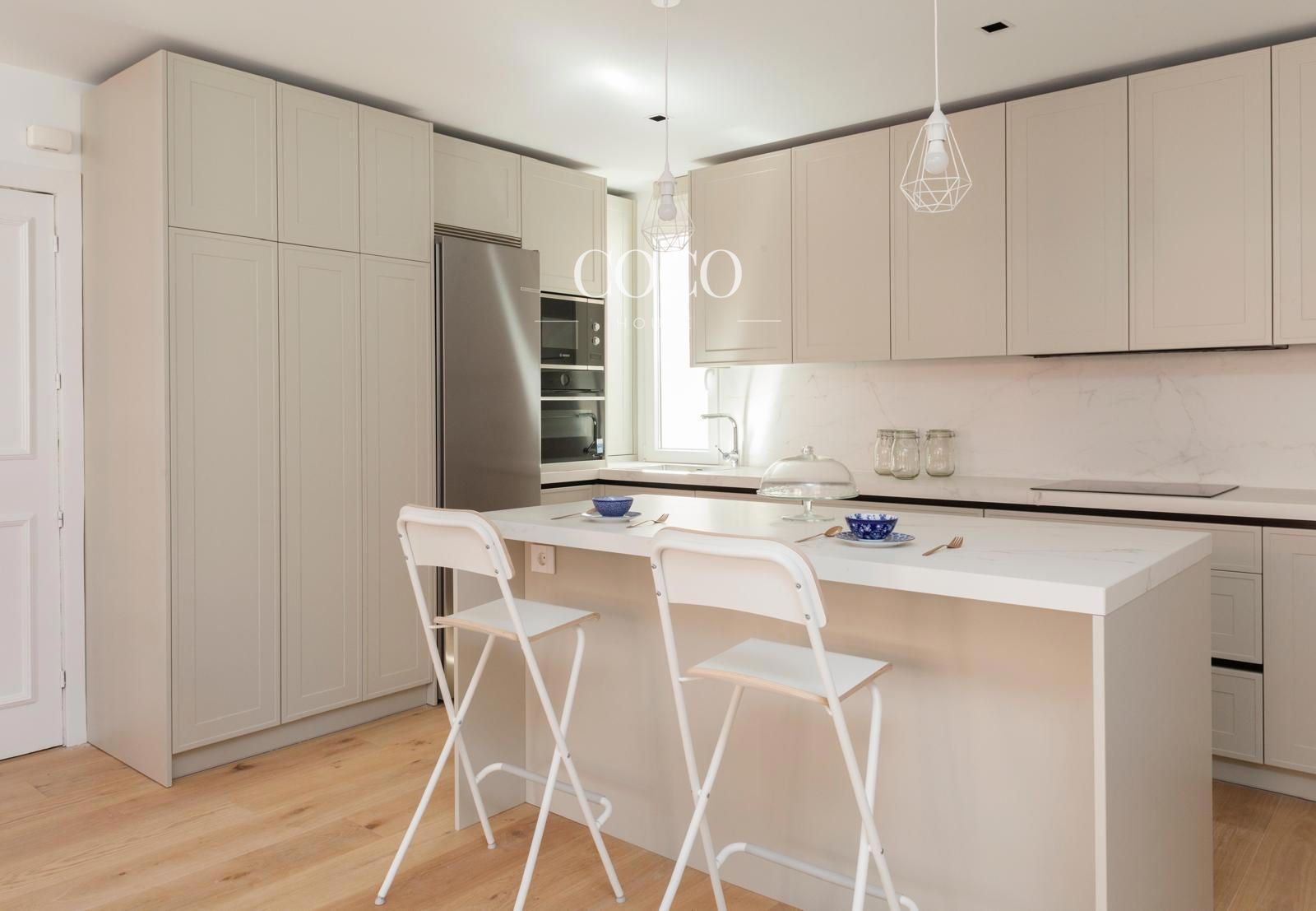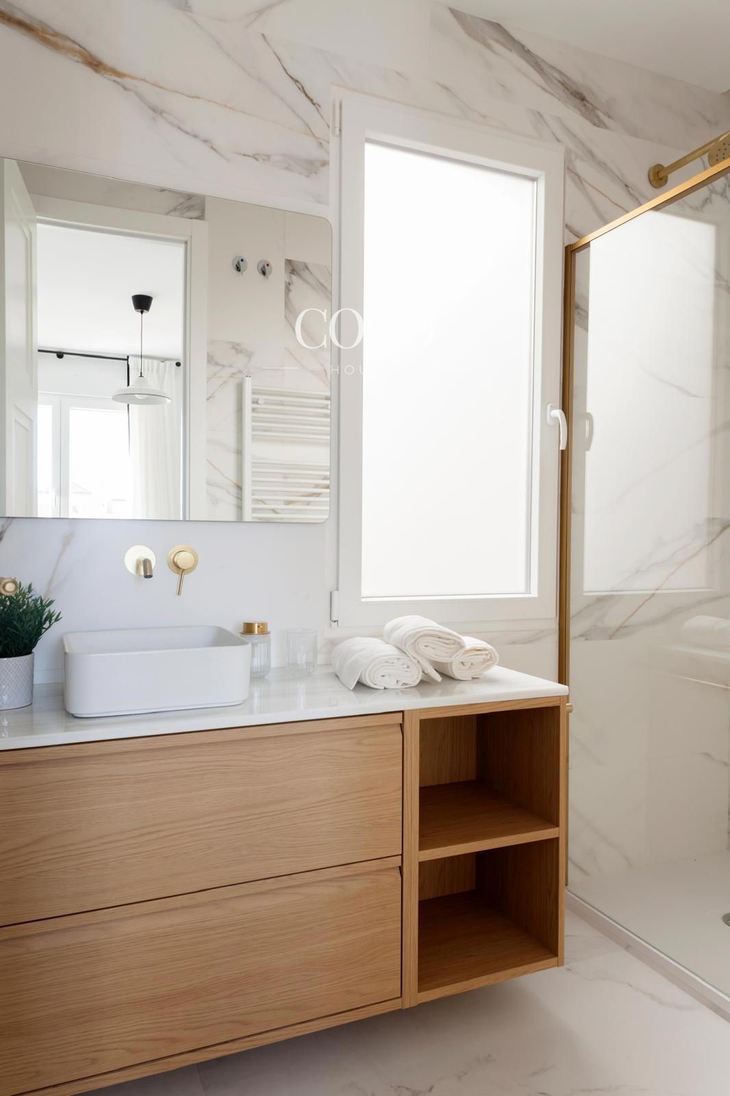 La distribución consta de tres dormitorios y dos baños, estando el principal configurado con baño en suite. La propiedad ha sido reformada utilizando materiales de alta calidad, destacando una cocina artesanal hecha a mano.