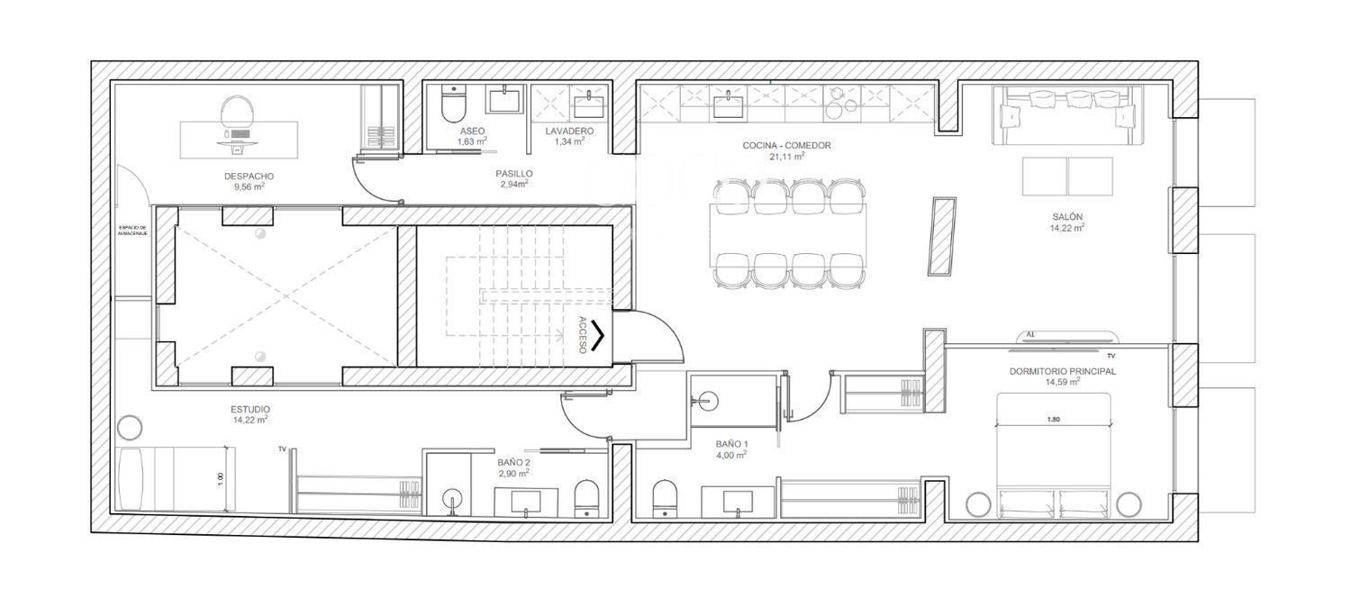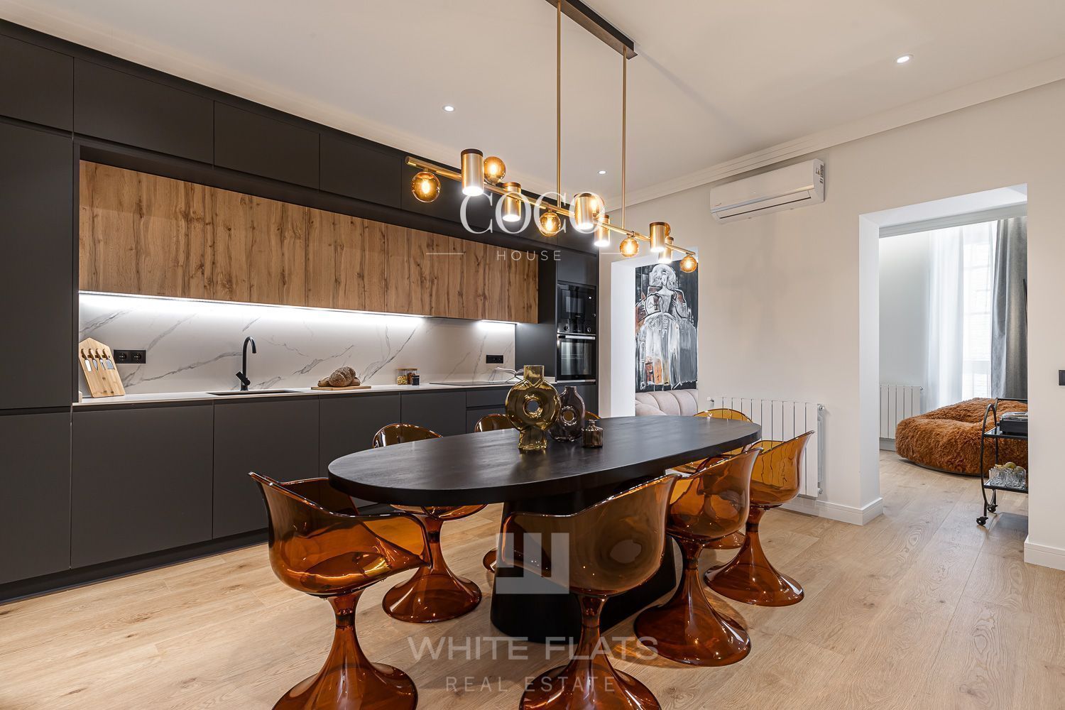 Las áreas sociales son espectaculares, pensadas como un verdadero punto de encuentro. El acogedor salón y el comedor se integran en un diseño que juega con contrastes y transparencias, conectando con la energía de la ciudad. La luz natural inunda el espacio gracias a sus tres balcones a la calle. Las ventanas cuentan con doble acristalamiento, lo que garantiza un excelente aislamiento acústico frente al bullicio del centro de Madrid.
