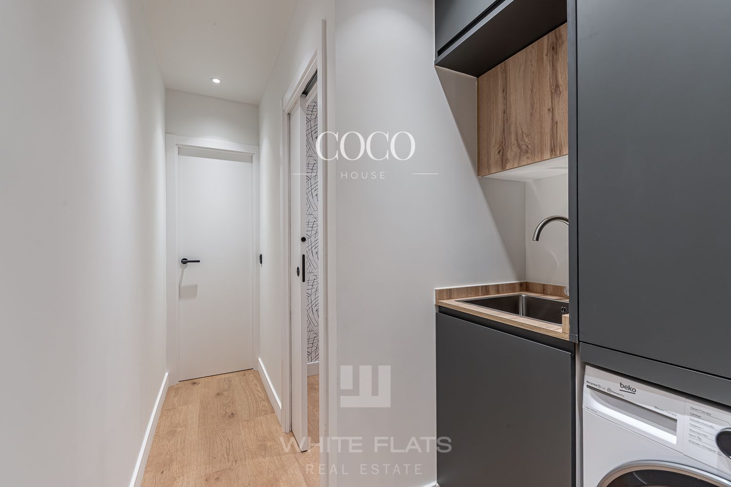 La cocina, de diseño moderno, queda perfectamente integrada en este espacio, ofreciendo funcionalidad y estilo. Además, la vivienda cuenta con un práctico aseo de cortesía y una zona de lavandería discreta y funcional.